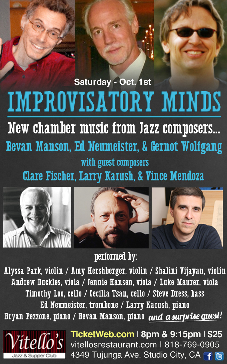 With works by Vince Mendoza, Clare Fischer (premiere), and the vibrant pianist Larry Karush.